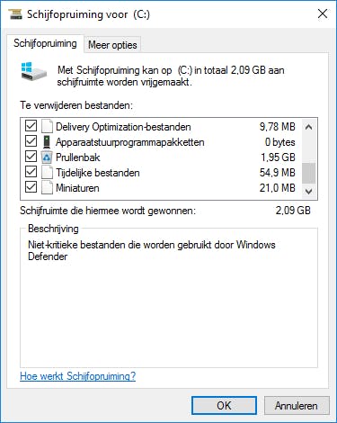 De meeste computergebruikers weten Schijfopruiming inmiddels wel te vinden, maar helaas benut lang niet iedereen alle mogelijkheden van dit hulpprogramma. Via een omweg gebruik je dit tooltje namelijk ook om systeembestanden op te ruimen, zoals restanten van Windows Defender en kopieën van stuurprogramma’s. Open via het Startmenu de applicatie Schijfopruiming en selecteer het station dat je wilt opruimen. Doorgaans is dat de C-schijf. Bevestig met OK en wacht af totdat Schijfopruiming klaar is met de analyse. Je kiest vervolgens voor Systeembestanden opschonen, waarna je nogmaals het juiste schijfstation aanwijst. Vink als laatste de bestanden aan die je wilt weggooien en bevestig met OK / Bestanden verwijderen.