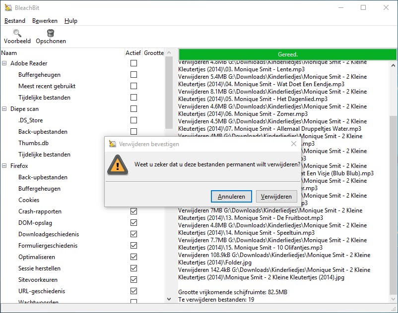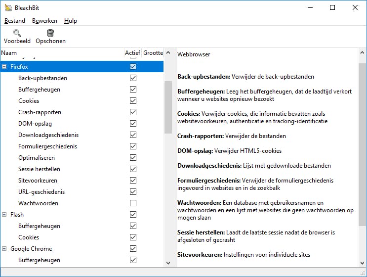 Maak dan ook vooraf beslist een herstelpunt aan. Vink in de linkerkolom alle onderdelen aan die je wilt opschonen. Bij sommige opties verschijnt er een waarschuwing in beeld dat deze actie veel tijd kost of wachtwoorden verwijdert. Zodra je klikt op Voorbeeld, laat BleachBit zien welke bestanden er voor verwijdering in aanmerking komen. Bovendien zie je ook hoeveel schijfruimte het tooltje vrij maakt. Klik op Opschonen / Verwijderen om de taak definitief uit te voeren.