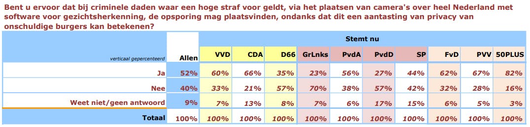 52 procent van de ondervraagden ziet het wel zitten, het 'plaatsen van camera's over heel Nederland met gezichtsherkenning-software', als dat dient om criminelen te vinden die kans hebben op een hoge straf. Vooral 50Plus-stemmers zijn hier voorstander van: 82 procent. Bij de PVV, Forum voor Democratie, VVD en CDA schommelen de percentages tussen de 60 - 67 procent.