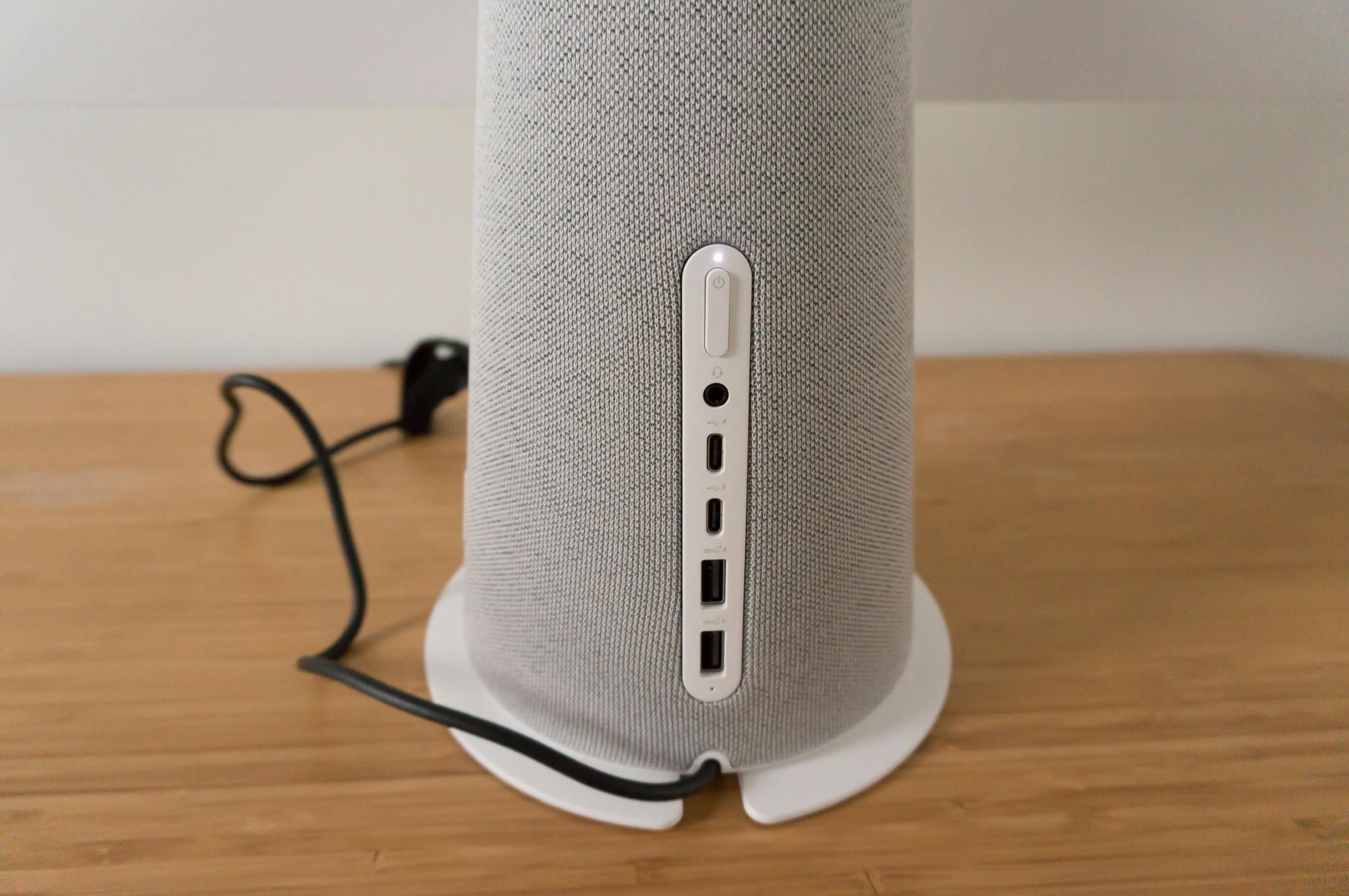 HP heeft voor de Chromebase 22 gekozen voor een opvallend ontwerp waarop de reacties wisselend zijn. De computer is verpakt in een met stof omtrokken pylon waar het scherm tegenaan geplaatst is. In die voet zitten behalve de computer ook de luidsprekers.