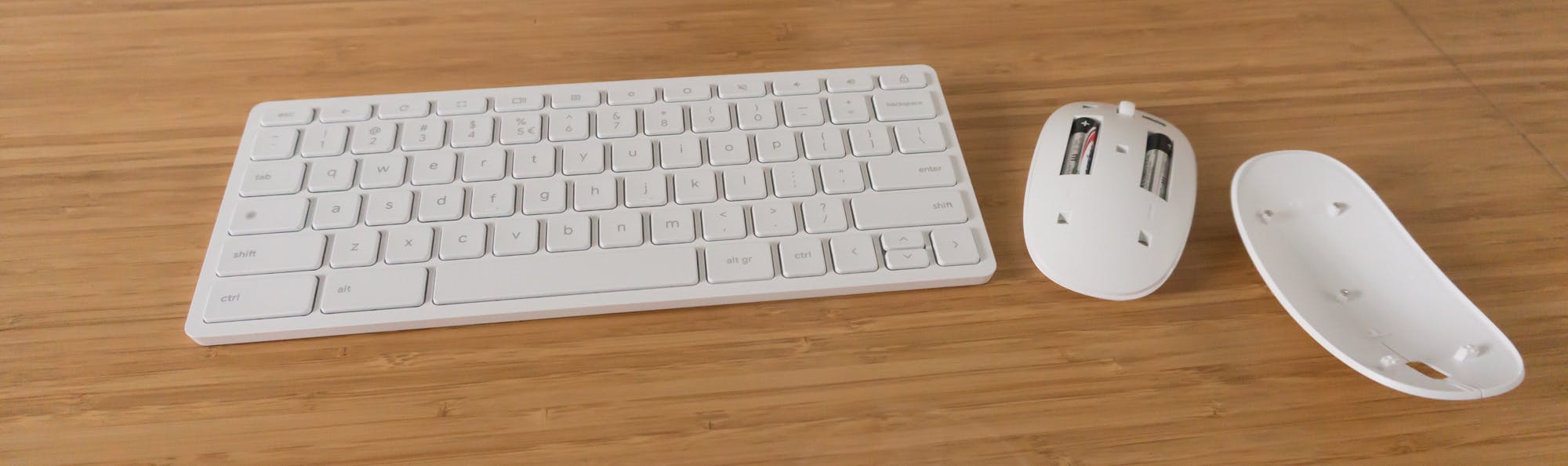 De muis zou ik wel vervangen. Deze qua vorm groot genoeg, maar hij is voor mijn smaak net te plat, heeft een erg onprettig scrollwieltje en geen bladerknoppen. Daar staat trouwens tegenover dat het toetsenbord wel een terugknop heeft, dus misschien is dat voor jou al afdoende. Zowel toetsenbord als muis worden via bluetooth verbonden en werken op twee AAA-batterijen.