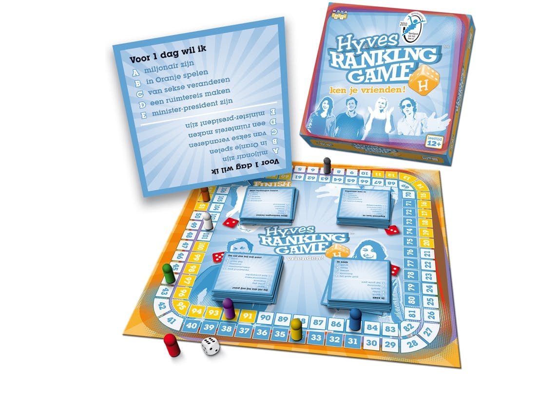 Omdat steeds meer speelgoed tegenwoordig elektronisch is, krijgen we hier op de redactie sinds een paar jaar steevast persberichten binnen over de Verkiezing Speelgoed van het Jaar. Dit jaar trok een van de genomineerde producten in de categorie 12+ onze aandacht.Begin september komt namelijk de Hyves Ranking Game (€ 24,99) op de markt, een bordspel voor 2 tot 8(!) spelers dat draait om één cruciaal gegeven: hoe goed kennen de spelers elkaar of hoe goed schatten zij elkaar in? De link met Hyves is duidelijk: dit spel is overduidelijk een 'social board game', terwijl Hyves het grootste sociale netwerk van ons land is...Aan de hand van onderwerpkaarten moet u vijf opties neerleggen in een volgorde die het beste bij u past. De anderen moeten dan uw ‘ranking' proberen in te schatten. Een goed voorspeld antwoord op positie 1 is 5 punten waard, op positie 2 is het 4 punten waard, enzovoort. Met elk verdiend punt gaat de pion van een speler één veld verder op het bord. Voor de spelers die meer inzicht in elkaars persoonlijkheid willen krijgen, is het speciale scoreblok een aanrader. Hierop wordt niet alleen duidelijk hoe goed een bepaalde speler de anderen kent (hoeveel punten scoort hij?), maar ook hoe goed de andere spelers hém kennen (hoeveel punten worden er op hem gescoord?). Een goede luisteraar praat namelijk niet altijd graag over zichzelf en een grote prater neemt vaak niet de moeite om naar anderen te luisteren...