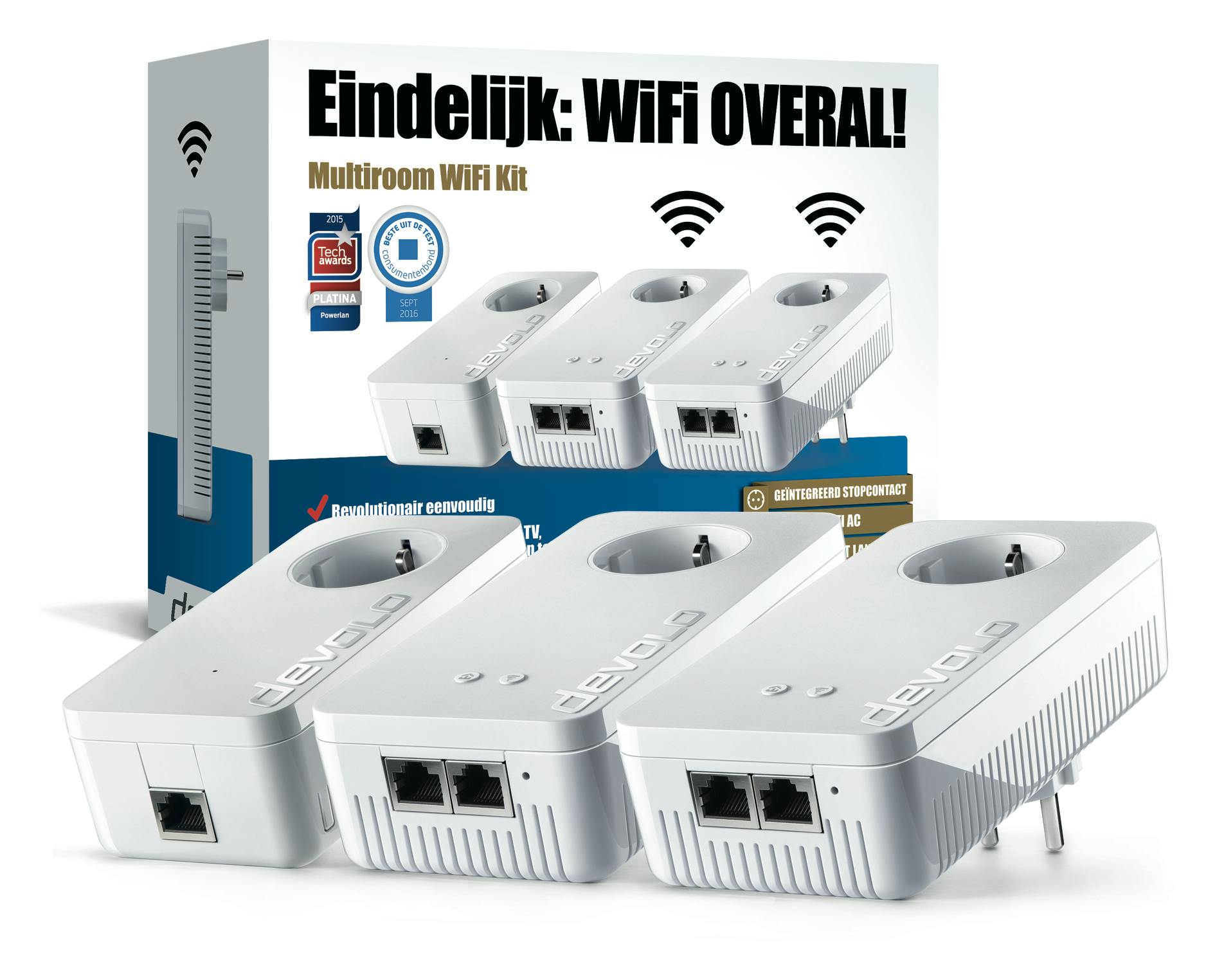 Wifi is maar een gedeelte van de oplossing, want het internetsignaal moet de accesspoints natuurlijk ook bereiken. Devolo is gelukkig dé specialist op het gebied van powerline-communicatie waarbij de bestaande elektriciteitsbekabeling wordt ingezet om het netwerksignaal te verspreiden. De twee wifi-hotspots in de Multiroom WiFi Kit maken gebruik van Devolo’s snelste 1200+ powerline technologie die een maximale snelheid van maar liefst 1200 Mbit/s biedt. De Multiroom WiFi Kit bevat een normale powerline-adapter die je aansluit op je router en zo het internetsignaal op de elektriciteitsdraden zet. Vervolgens kun je de wifi-hotspots in ieder stopcontact in je huis steken en heb je direct verbinding!
