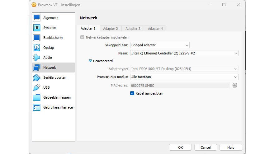 Het is fijn als je wat extra rekenkernen en geheugen hebt. Zorg ook dat virtualisatie voor je processor actief is in de bios voor jouw pc. Let verder goed op de configuratie van je virtuele machine voor Proxmox VE. Vink bij Systeem / Processor de optie Geneste VT-x/AMD-V inschakelen aan. Bij Netwerk / Adapter 1 kies je achter Gekoppeld aan liefst voor Bridged adapter. Selecteer dan achter Naam de netwerkadapter in jouw pc met een vaste netwerkaansluiting.