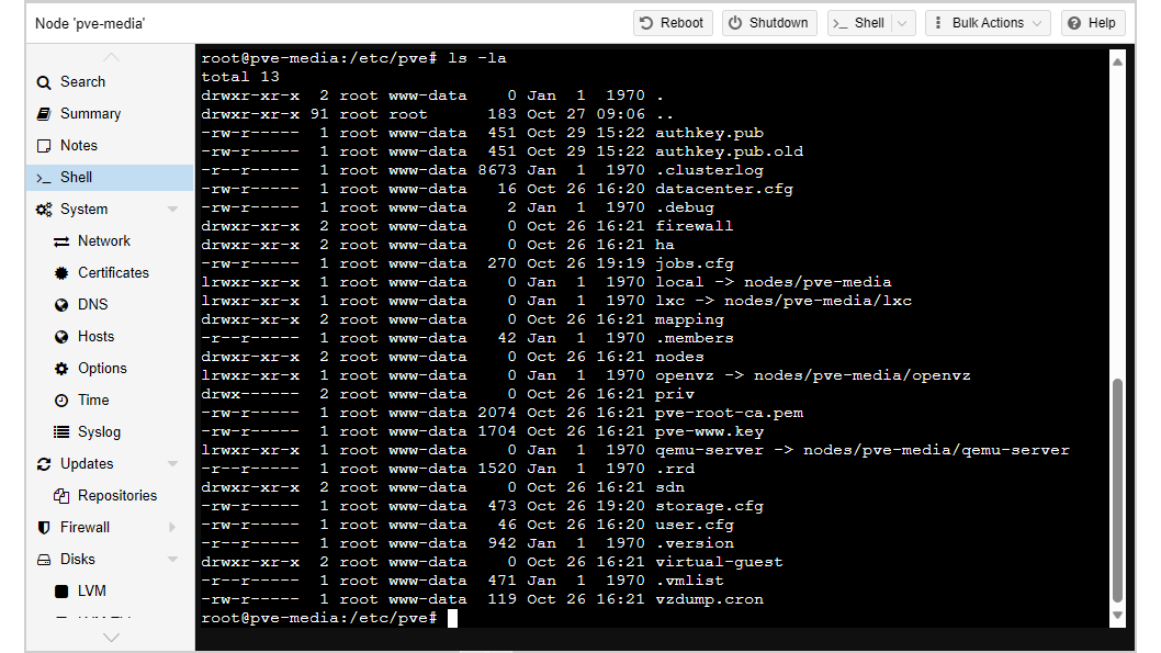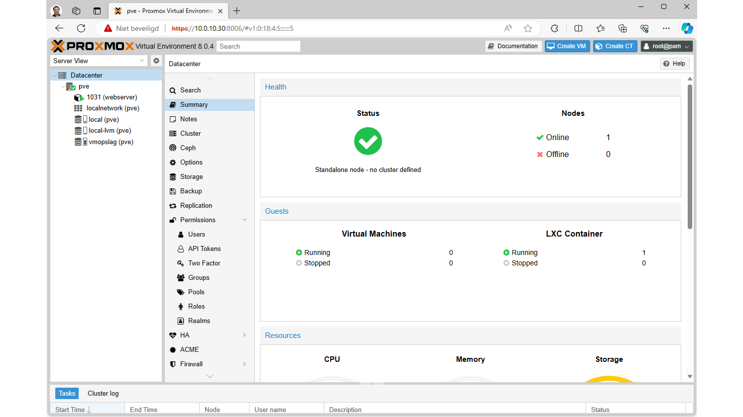De meeste tijd werken we op het niveau Datacenter / pve. Daar kun je alle relevante opties voor de host instellen, en ook containers en virtuele machines beheren.