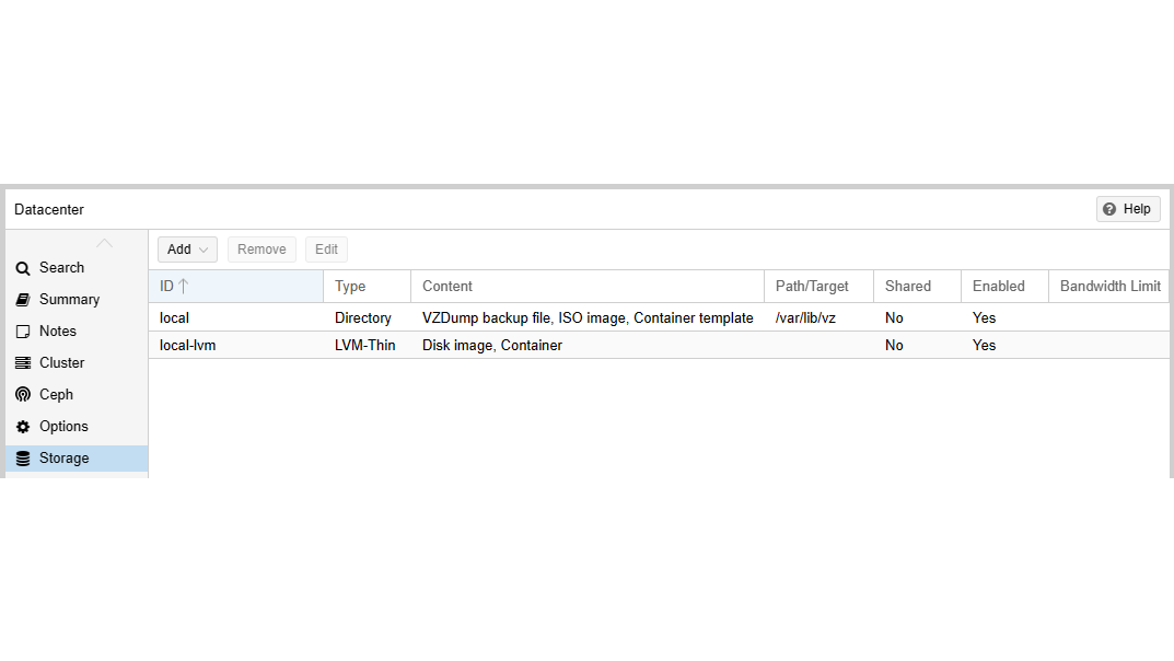 Onder Datacenter / Storage zie je welke opslag is geconfigureerd voor welke content. Standaard worden bij de installatie local en local-lvm aangemaakt. Daarbij wordt local gebruikt voor container-templates en iso-images, terwijl local-lvm dient voor de opslag van virtuele harde schijven van virtuele machines en voor gegevens van containers.