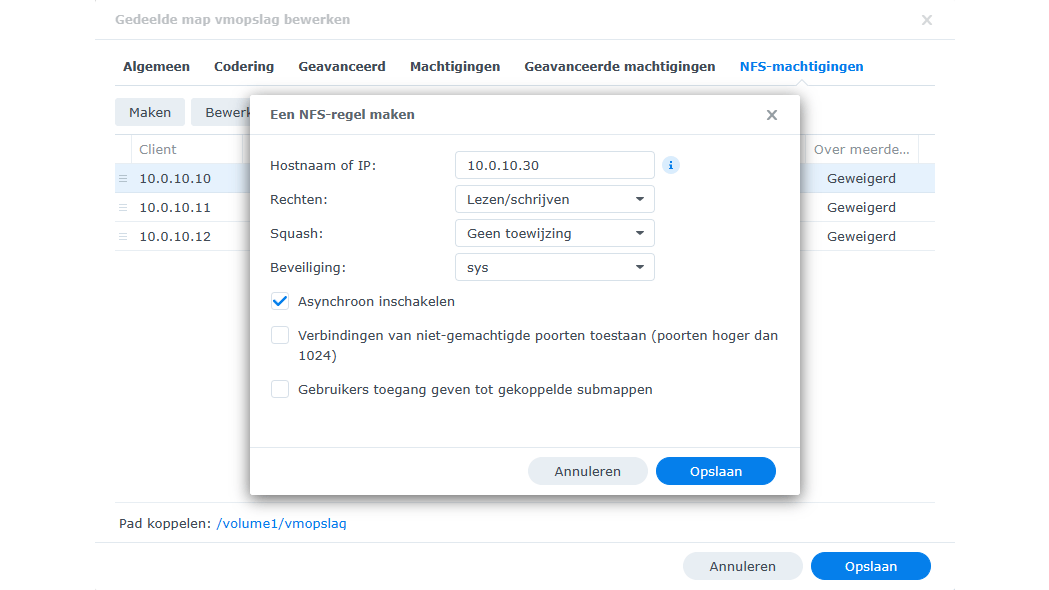 De toegang voor Proxmox VE regelen we op een andere manier. Selecteer daarvoor de bewuste map en kies Bewerken. Ga naar het tabje NFS-machtigingen en klik op Maken. Vul achter Hostnaam of IP het ip-adres in van de server met Proxmox VE. De overige opties hoef je niet te wijzigen. Bewaar de veranderingen. In de volgende paragraaf gaan we deze opslag toevoegen in Proxmox VE.