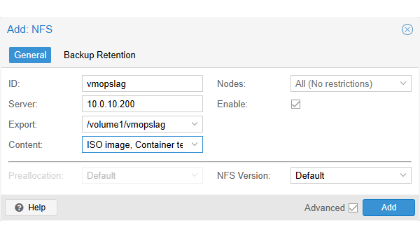 Ga in Proxmox VE naar Datacenter / Storage en kies Add / NFS. Vul achter ID een beschrijvende naam in, zoals vmopslag. Bij Server vul je het ip-adres van je NAS in. Klik op Export en kies de hiervoor aangemaakte map op de NAS. Bij Content kun je kiezen wat er op de NAS opgeslagen mag worden. We selecteren de opties ISO image, Container template en VZDump backup file.
