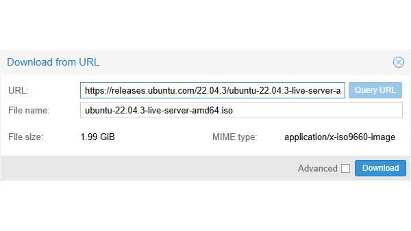 Als voorbeeld gebruiken we de link die we vinden op de server-downloadpagina van Ubuntu: https://releases.ubuntu.com/22.04.3/ubuntu-22.04.3-live-server-amd64.iso. Plaats deze volledige link in het venster achter URL en kies Query URL. De correcte bestandsnaam wordt ingevuld. Klik dan op Download.
