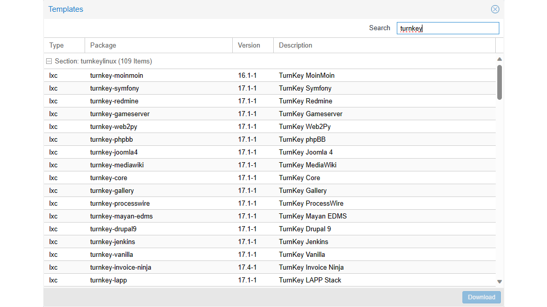 We gebruiken in dit artikel Ubuntu 22.04 als basis voor een container. Je kunt het template downloaden door deze aan te klikken en daarna op de knop Download te klikken.