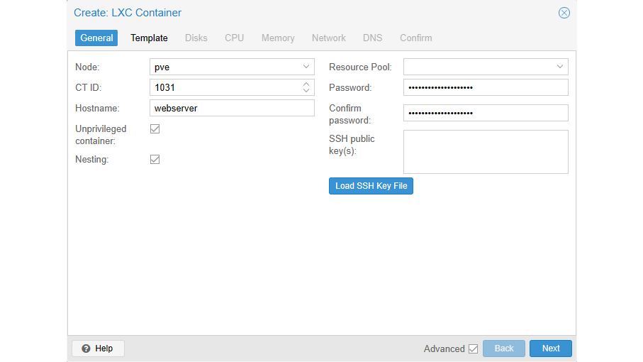 Om een container te maken, begin je met de blauwe knop Create CT. Op het tabblad General voer je bij CT ID een uniek nummer in voor de container en bij Hostname een herkenbare naam, zoals webserver. Bij Password en Confirm password voer je het wachtwoord in voor de root-gebruiker. Ga dan naar Template: hier selecteer je de opslag die je voor templates gebruikt (zoals local) en het template zelf, dat je hiervoor had opgehaald.