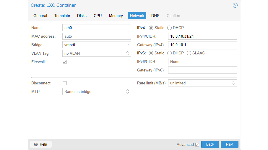 Het adres voor de eerste container schrijven we daarom als 10.0.10.31/24. Zelf vinden wij het handig als het nummer van de container (de CT ID) het ip-adres volgt. Daarom hebben wij voor de eerste container op 10.0.10.31 gekozen voor 1031 als uniek nummer.