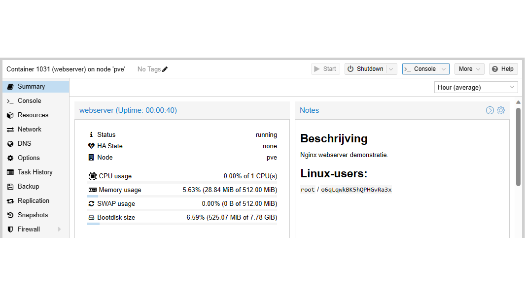 Klik je onder Datacenter / pve op de zojuist gemaakte container, dan zie je onder Summary de details voor deze container. Gebruik het gedeelte Notes voor bijvoorbeeld een beschrijving van de container of inloggegevens. Je kunt hier met Markdown-opmaak werken. Via Console kun je een opdrachtprompt voor je server openen en dan inloggen met je root-account. Hoewel je hiervoor natuurlijk ook ssh kunt gebruiken, geeft het een snelle ingang als je het nodig hebt. We gebruiken de opdrachtprompt in de volgende paragraaf voor de configuratie van Ubuntu.