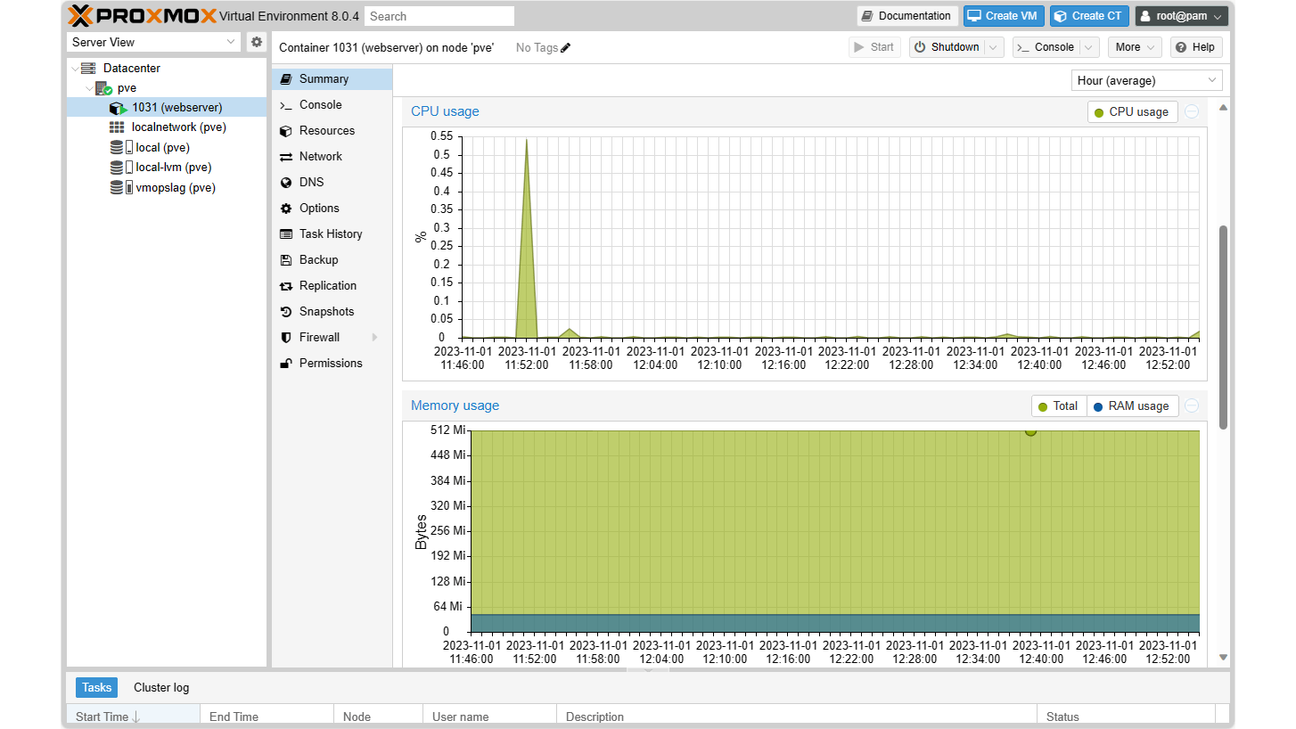 Dit heeft ook andere voordelen. Zo heb je alles voor één toepassing bij elkaar, is het handig voor back-ups en kun je bijvoorbeeld bronnen toewijzen, een opdrachtprompt openen en de container migreren naar een andere server met Proxmox VE (bij een cluster).