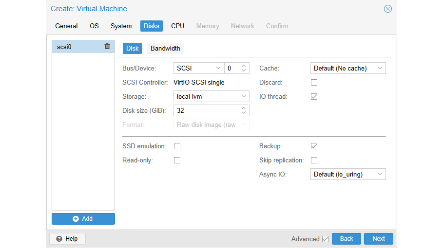 Je maakt een virtuele machine met de knop Create VM. Het is voor een deel vergelijkbaar met het toevoegen van een container. Meestal kun je de standaardinstellingen gebruiken. Op het tabblad OS kies je een iso-bestand met het gewenste besturingssysteem. Onder System configureer je de virtuele hardware. Onder Disks wijs je opslagruimte toe en bij Memory geef je aan hoeveel geheugen de virtuele machine krijgt. Bij veel besturingssystemen kun je de optie Ballooning Device aanzetten. Die optie zie je overigens alleen als je een vinkje bij Advanced zet. Daarmee geeft een virtuele machine een teveel aan geheugen terug aan de host.
