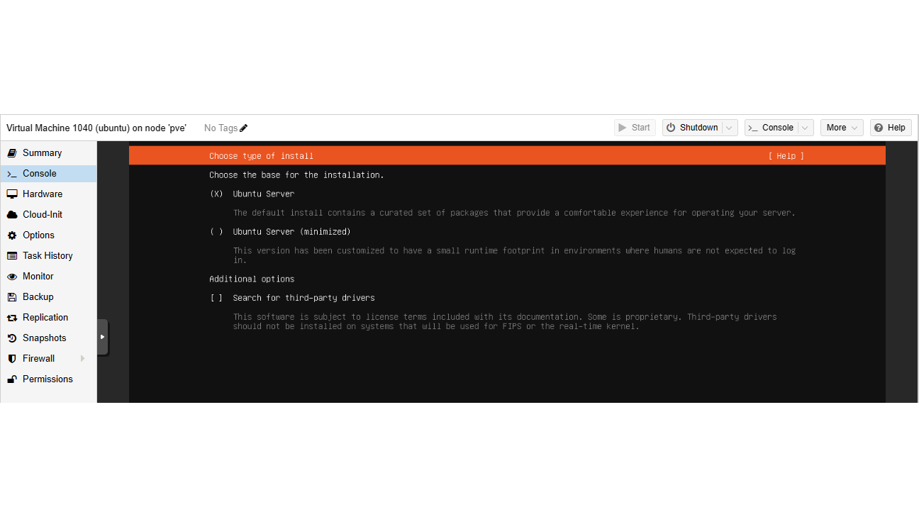 Bij het starten van de virtuele machine start ook gelijk de installatie voor de virtuele machine. Dit kun je via Console volgen. Veel instellingen (zoals gebruikersaccounts en netwerk) regel je nu uiteraard binnen de server en grotendeels al tijdens de installatie. Wil je een mooier beeld, dan kies je rechtsboven onder Console voor noVNC. Ook Spice is een goede optie, maar vereist wat extra software.