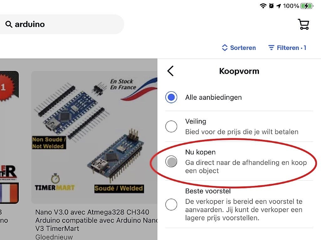 Ben je niet iemand die het geduld heeft voor veilingen, dan kun je ook selecteren op directe verkoop. Tik daarvoor bovenaan weer op Filteren en dan onder Koopvorm op Nu kopen. Een directe koop voorkomt meteen ook teleurstellingen, want de meeste veilingen worden in de laatste seconde overboden door sniper-software. Die kun je als ‘veilingjager’ op je pc installeren, waarna je een maximumbod in de software instelt. Dat bod wordt pas op het allerlaatste moment uitgebracht. De kans is vrij groot dat als je jouw bod in het sniper-programma op een paar Euro meer instelt dan wat er geboden lijkt te gaan worden, het object van jou is. Ietwat flauw, maar zo gaat dat tegenwoordig. Sniper-software is een artikel apart waard, en laten we nu voor wat het is.