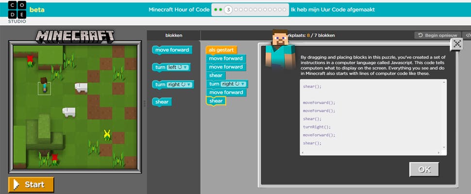 Op de website van Code.org is het Minecraft-spelletje te vinden. Nadat je een personage hebt uitgekozen, kun je hem of haar opdrachten geven door blokken met acties als 'beweeg vooruit' of 'draai links' te kiezen. Elk blok staat voor een Javascript-code, die je te zien krijgt zodra je de puzzel hebt opgelost. Of door simpelweg te kiezen voor 'Code weergeven', rechts bovenaan.