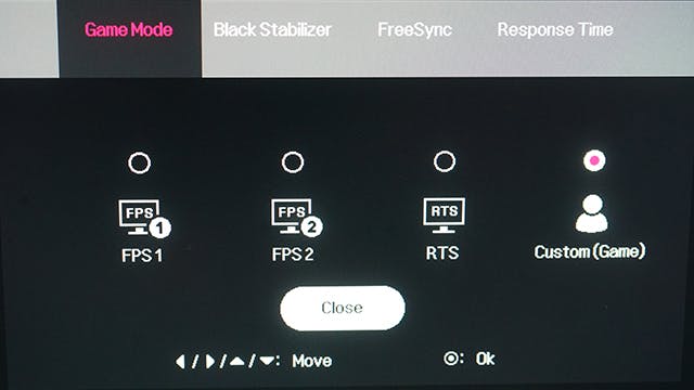 Het scherm heeft meerdere speciale gamingmodi, waarin allerlei instellingen standaard correct ingesteld zouden moeten zijn. Deze modi zijn direct toegankelijk via het OSD. In dit optie-scherm kunnen vier verschillende gamingmodi geselecteerd worden: twee voor first person shooters, een voor RTS-games en een met zelf ingestelde opties. In de tabbladen hier kunnen ook de Black Stabilization, OverDrive- en FreeSync-instellingen aangepast worden. Dit is veel eenvoudiger dan het opzoeken van dezelfde opties in het instellingsmenu.