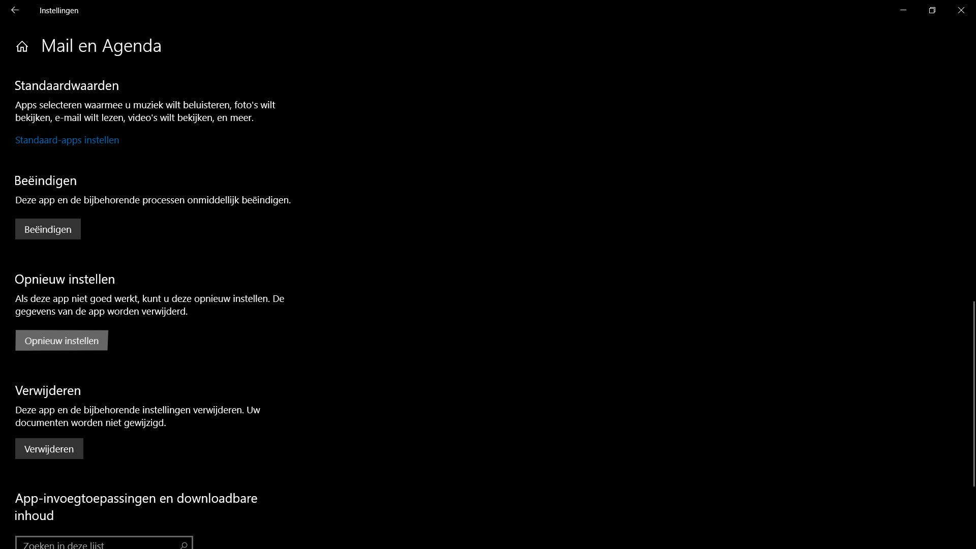 Een derde optie is het resetten van de app. Open het powermenu van Start (met de rechter muisknop) en druk op Apps en onderdelen. Zoek de Mail en Agenda-app op en druk op Geavanceerde instellingen. Scrol in het volgende venster naar Opnieuw instellen en druk op de bijbehorende knop. Daarna zouden de problemen kunnen verdwijnen.
