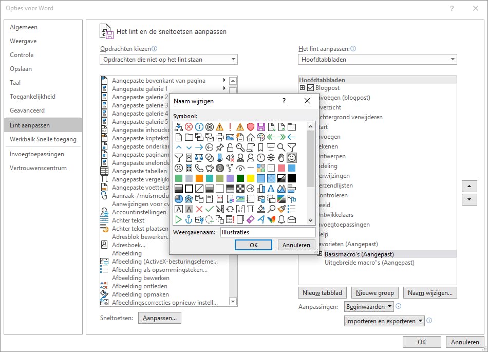 In dit venster kun je ook de volgorde van de hoofdtabbladen wijzigen. Je klikt op zo’n hoofdtabblad en sleept dat hoger of lager in de rangorde. Een nieuw tabblad voeg je logischerwijs toe met de knop Nieuw tabblad. Er zijn gebruikers die op die manier bijvoorbeeld een extra tabblad maken om hun macro’s te beheren, of om bepaalde vormen of pictogrammen bij de hand te houden.