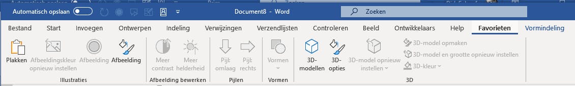 In dit voorbeeld maken we een tabblad Favorieten, waarin we de groep Illustraties toevoegen. Naderhand ziet het lint er dan als volgt uit: