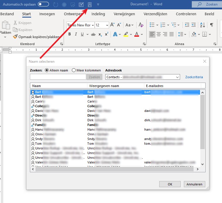 Hierna zie je dat er bovenaan in de werkbalk het pictogram van het Adresboek is bijgekomen. Wanneer je nu de muisaanwijzer in het Word-document plaatst en je op dit adresboekpictogram klikt, dan kun je een naam in het geselecteerde Outlook-adresboek selecteren. De gegevens die je op deze manier kunt importeren, zijn uiteraard afhankelijk van de informatie die je voor deze contactpersoon hebt ingevoerd.