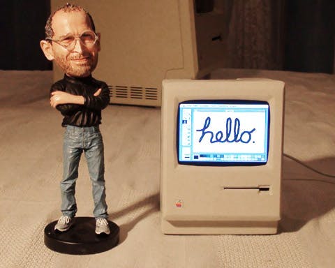 De Mini Mac naast een mini Steve Jobs
