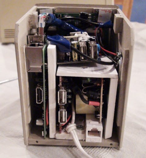 Aan de achterzijde zien we een aantal moderne aansluitingen terug die op de Raspberry Pi zitten en heeft John ook een usb-hub ingebouwd. De voedig is ook in de behuizing gepropt.