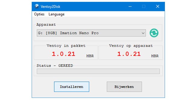 De usb-stick hoort nu in het Apparaat-veld te verschijnen en bij Status zie je GEREED staan. Bevestig met Installeren en met Ja (2x). Even later is de installatie klaar en zie je bij Ventoy op apparaat het Ventoy-versienummer verschijnen. Overigens kun je met de knop Bijwerken altijd een nieuwere versie op de ubsb-stick installeren, met behoud van eventuele image-bestanden of andere data.
