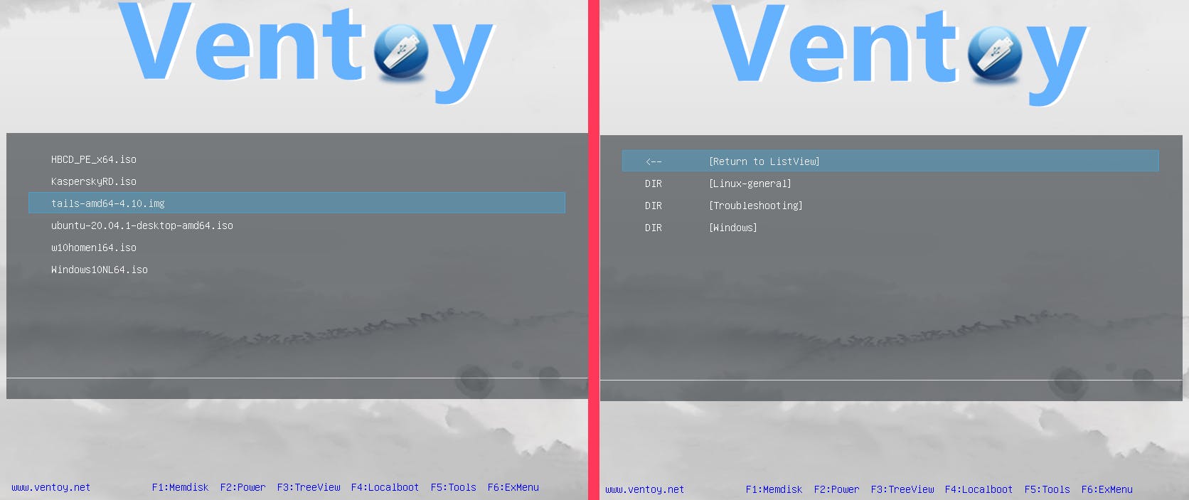 Immers, zodra je een systeem opstart van je Ventoy-stick via het speciale bootselectie-menu of desnoods vanuit het bios (raadpleeg daarvoor je systeemhandleiding), zal Ventoy deze image-bestanden detecteren en ze als selecteerbare items in een opstartmenu tonen. Je hoeft dan alleen nog maar het gewenste besturingssysteem te selecteren. Zie je liever de mappenstructuur binnen je Ventoy-partitie in de vorm van een boomstructuur, druk dan op de F3-toets (TreeView).