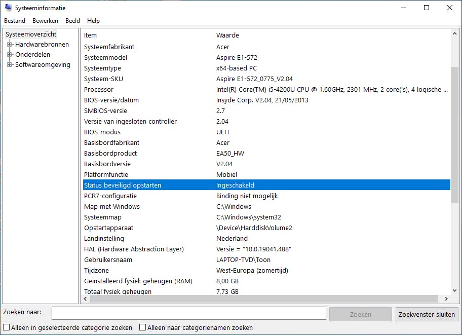 In Windows kom je snel te weten of die functie is ingeschakeld. Druk op Windows-toets+R en voer msinfo32 uit. Als je Ingeschakeld ziet staan bij Systeemoverzicht / Status beveiligd opstarten, dan is secure boot actief.