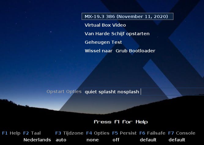Na enkele ogenblikken verschijnt het installatiemenu in beeld. Druk op F2 en gebruik de pijltjestoetsen om Nederlands te selecteren. Bevestig daarna met Enter. Je ziet bovenaan in het installatiemenu het versienummer en de publicatiedatum van MX Linux staan. Selecteer deze optie en druk op Enter.