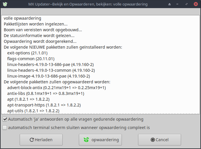 Zorg er hierna voor dat MX Linux volledig up-to-date is. Klik in het zijpaneel op het groene pictogram met de uitgeklapte doos om het hulpprogramma MX Updater te openen. Vink hierbij de optie Automatisch ‘ja’ antwoorden op alle vragen gedurende opwaardering en bevestig met Opwaardering. Typ het wachtwoord om het updateproces te starten. Je volgt de voortgang in een commandovenster.