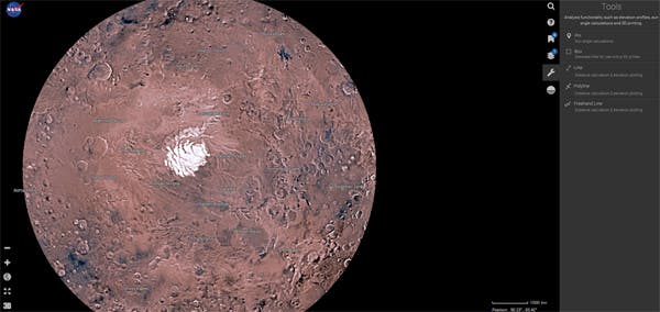 NASA heeft daarvoor twee websites in het leven geroepen. De eerste is Mars Trek. 50 jaar aan verzamelde data is daar samengevoegd om een respresentatieve 3D-weergave te maken van de rode planeet. Je hebt er ook tools ter beschikking die je bijvoorbeeld de afstand tussen bepaalde punten laat meten, om zo te achterhalen hoe enorm groot Mars eigenlijk is.