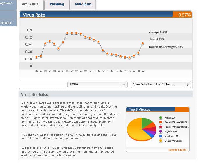 In real time bekijken hoe het staat met digitale bedreigingen: dat kan via MessageLabs Threat Watch.