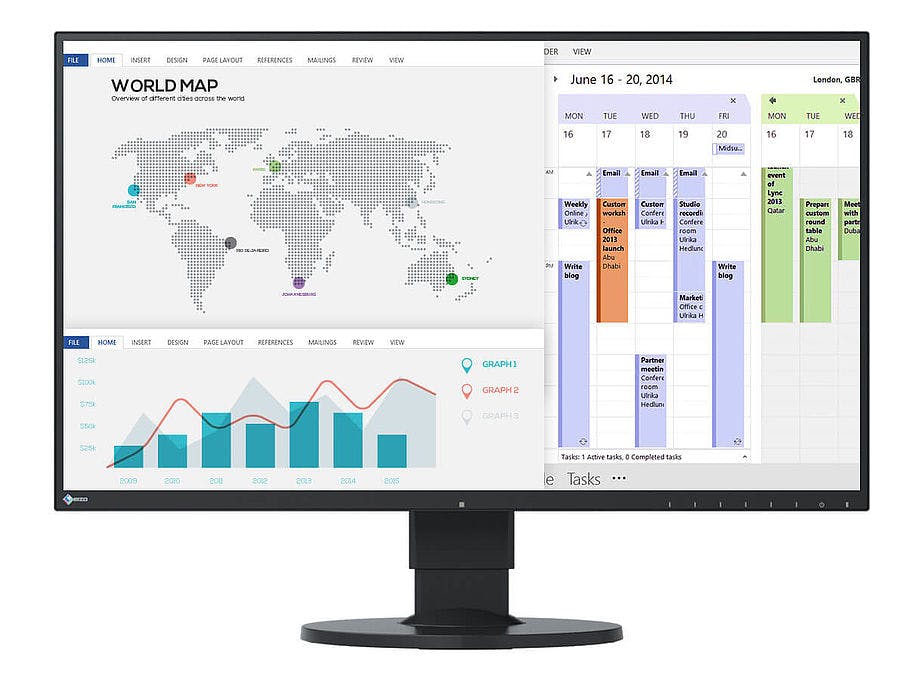 Naast een elegant design aan de voorkant, is ook aan de achterkant gedacht, met een slank profiel, en elementen die ervoor zorgen dat kabels volledig uit het zicht weggewerkt kunnen worden, hetgeen nog meer bijdraagt aan een rustige werkomgeving. Dit 24,1-inch beeldscherm heeft een resolutie van 1920 x 1200 pixels met een maximaal contrast van 1000:1, en optimale kijkhoeken dankzij het IPS-paneel. Dit model heeft, overigens evenals de EV2450 een automatische kleurmodus, zodat je kunt kiezen voor de optimale kleurweergave met één druk op de knop. Dat is belangrijk, want een filmpje kijken vereist natuurlijk een andere kleurweergave dan tekst lezen. Ook hier vind je de flexibele voet die ervoor zorgt dat je minder snel last van je rug en nek krijgt bij langdurig gebruik.