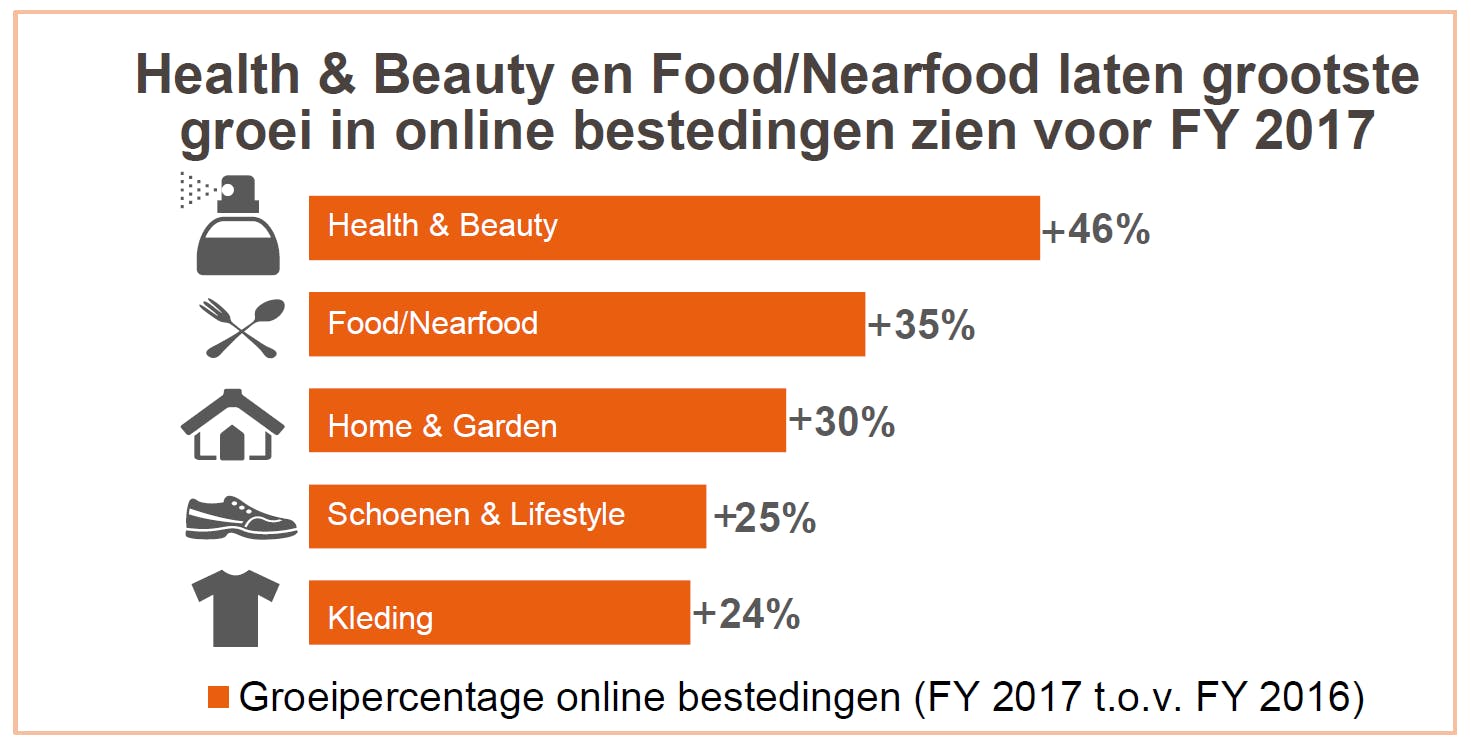 In totaal gaven we 22,5 miljard euro uit en kochten we online 201,7 miljoen producten. De sector zag daardoor een omzetgroei van 13 procent ten opzichte van 2016. Er wordt vooral meer uitgegeven aan gezondheids- en schoonheidsproducten, maar ook op gebied van eten, wonen/tuin, schoenen/lifestyle en kleding kopen we telkens meer.