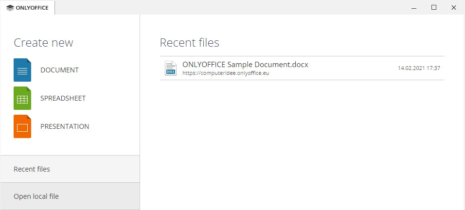 Wanneer je OnlyOffice na de installatie opstart, beland je in een startvenster. Daar kun je vanuit de linkerkant drie verschillende documenttypes creëren: Document, Spreadsheet en Presentation. In het linkervenster vind je ook de opties Recent files en Open local file.