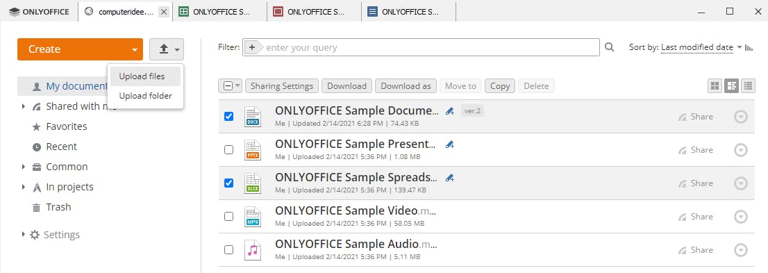 Zowel de interface als de functionaliteit van de drie editors zijn nagenoeg identiek aan die van de desktopversie. Via Create kun je eigen documenten creëren en met de pijlknop linksboven is het mogelijk eigen bestanden en mappen naar je OnlyOffice-cloud te uploaden.