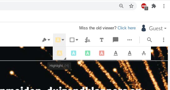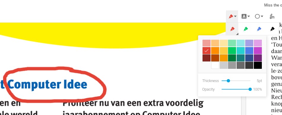 De knoppen in het rechterdeel van de knoppenbalk zijn eigenlijk het interessantst. Klik op de A (standaard van een geel achtergrondje voorzien) en je krijgt de beschikking over een markeerstift in diverse kleuren. Je krijgt ook opties om tekst door te halen of onderstrepen.
