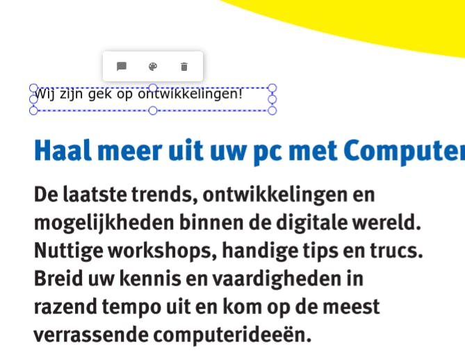 Om tekst traditioneel geel te markeren, klik je op – hoe verrassend - de gele kleur. Klik op het begin van een stuk tekst dat je wilt markeren, blijf de linkermuisknop ingedrukt houden en sleep tot het eind, om daar de knop weer los te laten. Probeer zeker ook de genoemde doorhaal-, onderstreep- en onderkringelfuncties even uit.