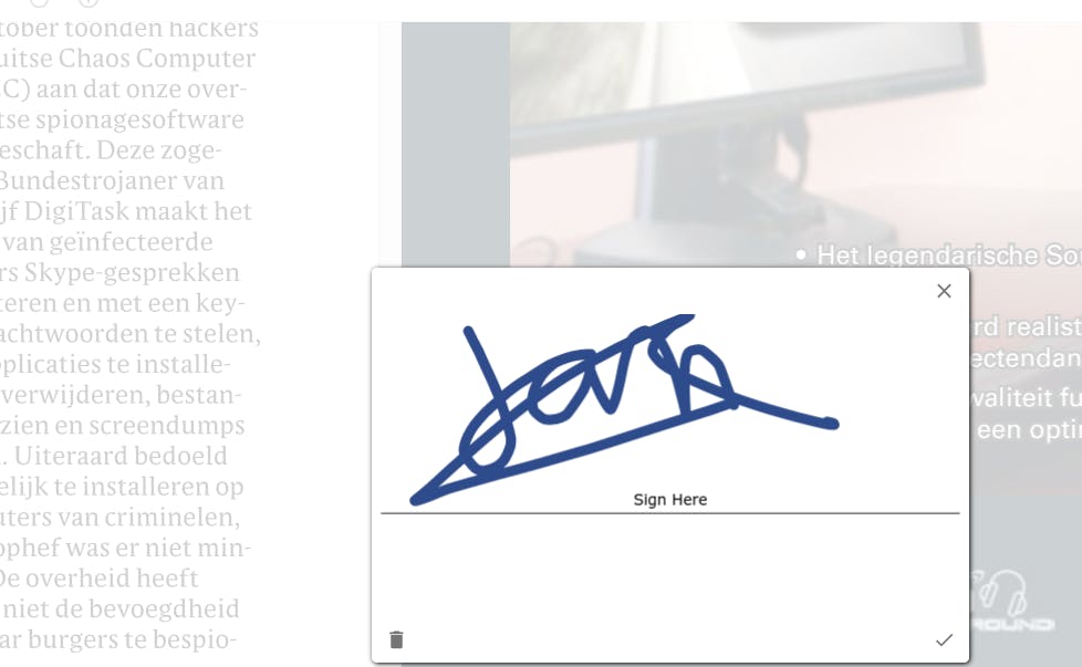 Klik hiervoor op de handtekeningknop, direct naast de vormenknop. Via het driehoekje onder in de knop kun je zaken als lijndikte en kleur instellen. Klik vervolgens in het formulier, of in dit voorbeeld ergens op een lege plek, waar je een handtekening wilt plaatsen. Teken de handtekening en klik daarna op het vinkje rechtsonder in het handtekeningen-hulpje. De gelukkige bezitters van een aanraakscherm kunnen overigens met hun vinger in de weer.