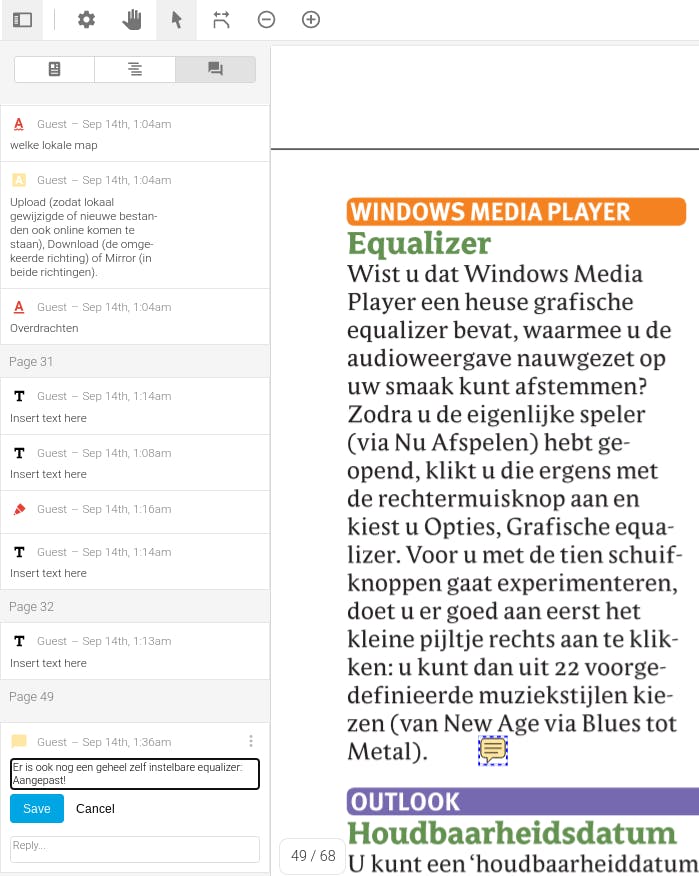 Voor voorgestelde aanpassingen kun je beter gebruikmaken van het opmerkingen-gereedschap. Klik op de knop met de tekstballon (rechts van de T-knop) en klik vervolgens in de tekst waar je een opmerking wilt plaatsen. Op die plek verschijnt een klein tekstballon-pictogram, terwijl tegelijkertijd een venster aan de linkerkant opent. Hier tik je je opmerking, gevolgd door een klik op Save.