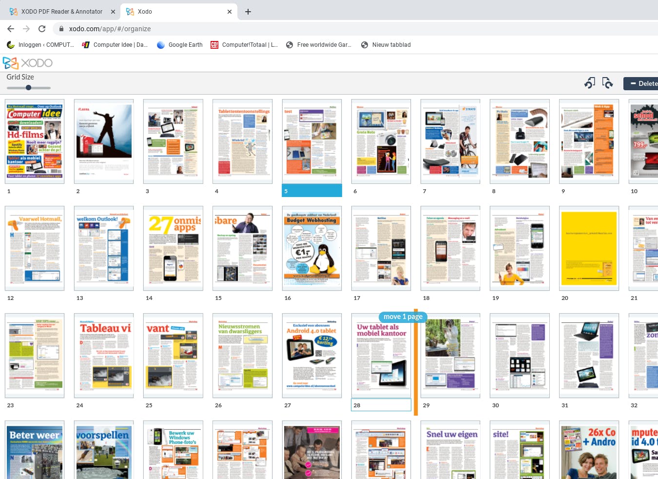 Om pagina’s van plek te veranderen, sleep je ze in het miniaturenoverzicht. Dat verschijnt na op de startpagina van Xodo op Launch now en dan op Organize pages te klikken. Hier sleep je een pdf in het uploadvlak naar elke gewenste positie. Downloaden van de aangepaste pdf gaat via de Save-knop rechtsboven in beeld. Om een pagina te draaien, maak je gebruik van de draaiknopjes. Alles in één keer draaien? Druk dan op Ctrl+A klik en klik daarna op een van de draaiknoppen.