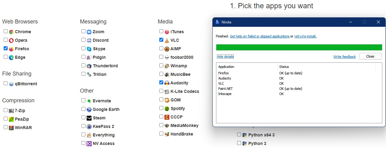 We beginnen met een bekende naam voor het automatisch installeren en updaten van enkele tientallen bekende freeware-applicaties: Ninite. Op de website vink je de gewenste programma’s aan, waarna je op Get Your Ninite klikt. Dit levert een aangepaste installatietool op die je alleen maar uit hoeft te voeren om de gevraagde applicaties te installeren in de standaard installatielocaties. In de meeste gevallen gebeurt dit zonder verdere tussenkomst van de gebruiker, en waar mogelijk gebeurt het zelfs in dezelfde taal als je Windows-installatie.