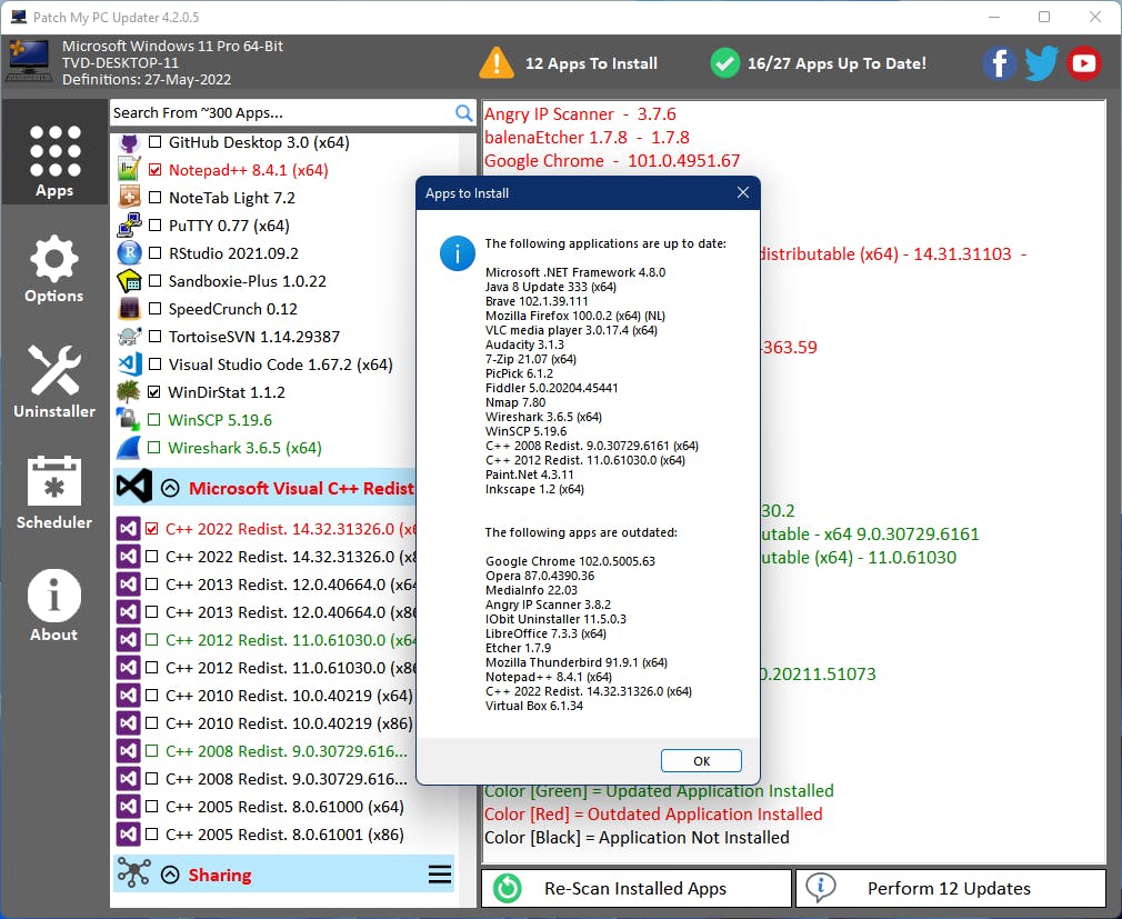 Meteen na het opstarten van de tool worden de gerubriceerde apps in drie mogelijke kleuren weergegeven: zwart (nog niet geïnstalleerd), rood (update is beschikbaar) en groen (geïnstalleerde versie is up-to-date). Standaard worden alleen de rode, verouderde apps geselecteerd. Klik op x/y Apps Up To Date! om te zien welke versie zal worden geïnstalleerd zodra je op de knop Perform x Updates drukt. Ook nog niet geïnstalleerde apps kun je aanvinken om te laten installeren.