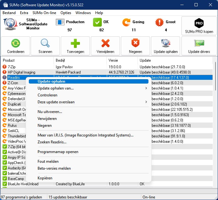 Met veel van de genoemde tools zet je ook nog niet geïnstalleerde programma’s op je pc. SUMo, voluit Software Update Monitor is daarentegen een rasechte updatebeheerder. Na een snelle scanronde somt SUMo de gedetecteerde programma’s op, en dat gebeurt grondig. Zo vond SUMo er op ons testsysteem 97, tegenover 28 bij Home Updater. De maker claimt minimaal 30.000 softwaretitels in zijn database te hebben. Portable programma’s kun je zelf toevoegen door naar het exe-bestand te verwijzen. Herkent SUMo het programma, dan zal het voortaan ook dat programma op updates controleren. Handig is nog dat SUMo een (kleur)onderscheid maakt tussen grote en kleine updates.