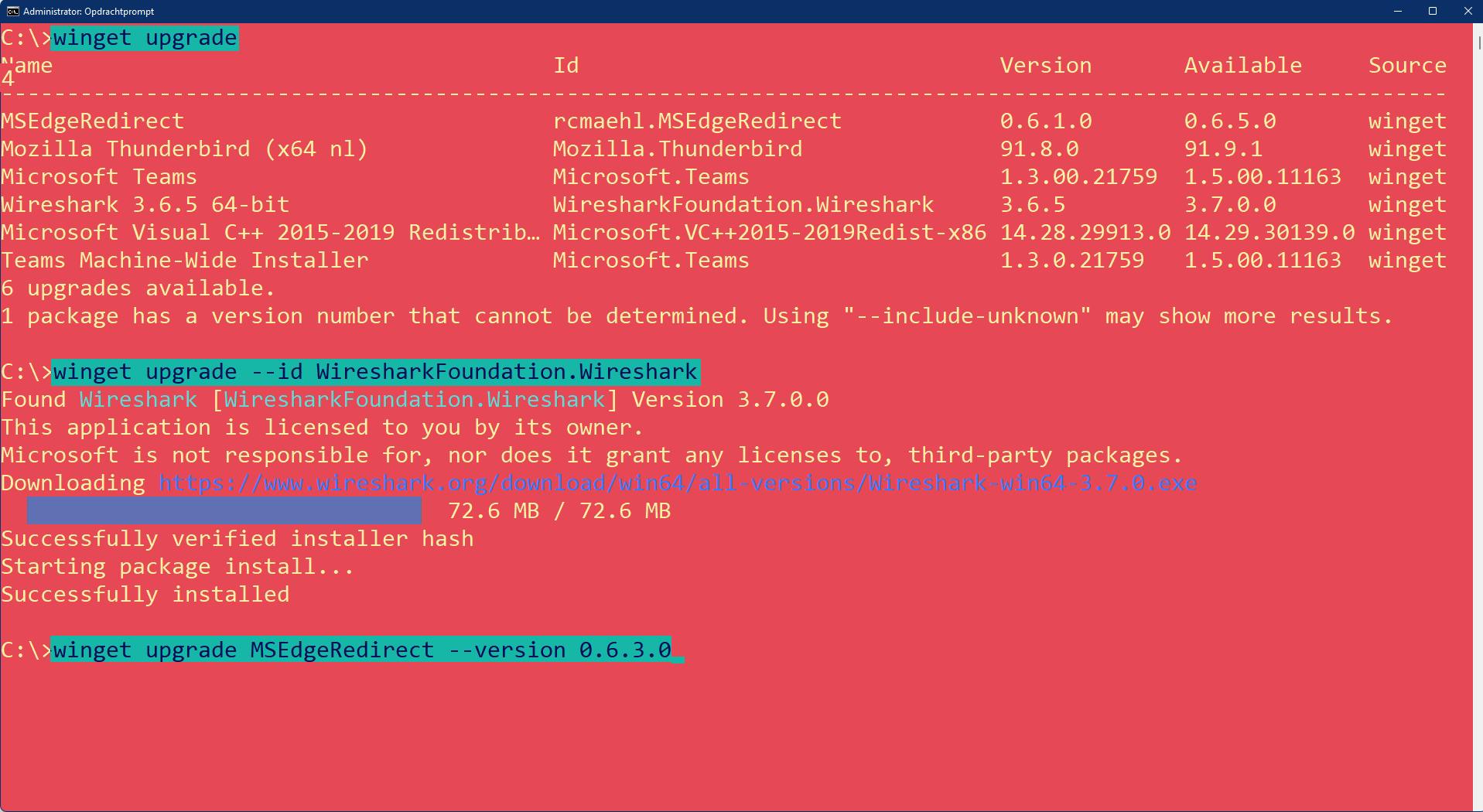Met winget list krijg je een overzicht van alle geïnstalleerde toepassingen, waarbij je eveneens in de kolom Available ziet of er een upgrade beschikbaar is.