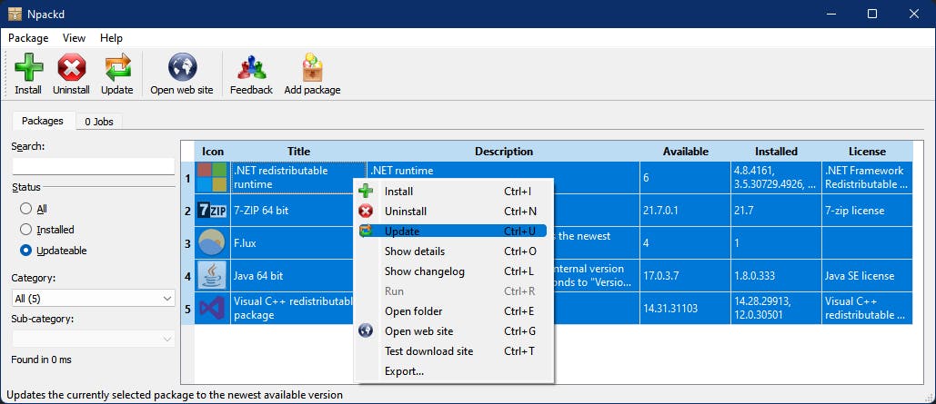 WinGet en Chocolatey zijn de populairste, maar niet de enige gratis pakketbeheerders onder Windows. Zo is er ook nog het opensource Npackd (www.kwikr.nl/npackd, zowel in een grafische als een opdrachtregel-versie), dat momenteel zo’n 1330 pakketten beschikbaar heeft. In de grafische versie hoef je slechts Updateable te selecteren om de applicaties te zien die je kunt updaten: druk op Ctrl+A om deze te selecteren, klik met rechts op je selectie en kies Update.